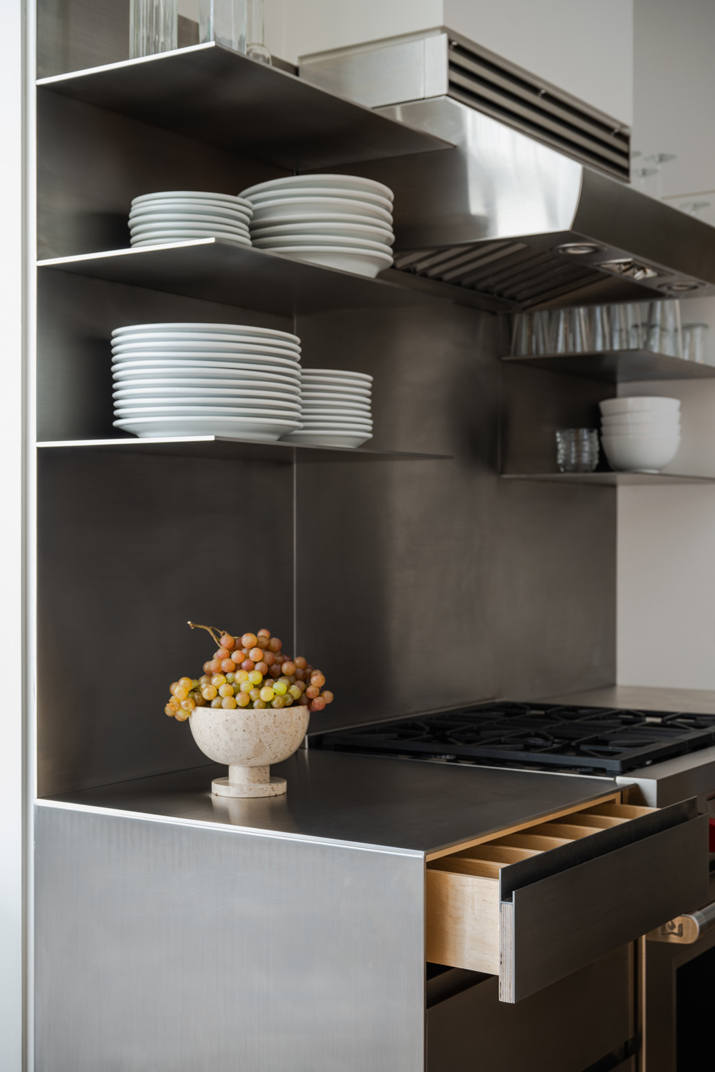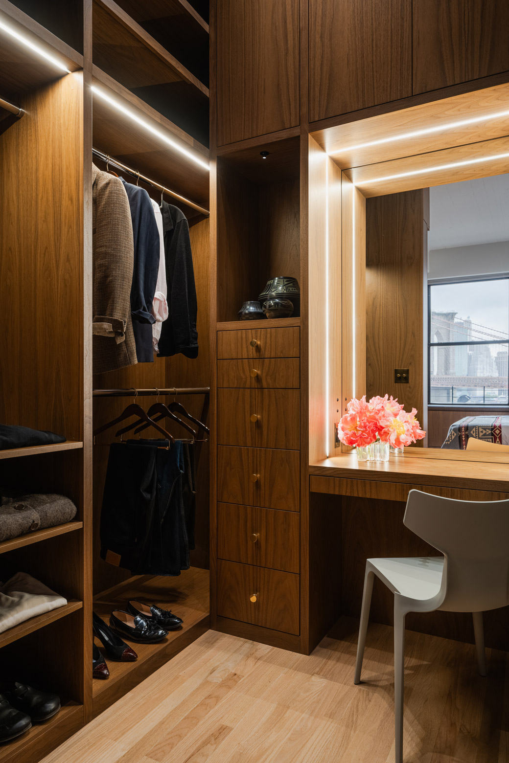 This Brooklyn home was designed to feel warm, calm, and inviting. The dining space features rich walnut paneling that wraps from the walls to the ceiling, creating a cozy, tucked-away feel. Simple vintage chairs and a dark table add character, while soft light filters in through frosted glass doors. It’s a quiet, thoughtful space—perfect for gathering, relaxing, and enjoying the beauty of good design.